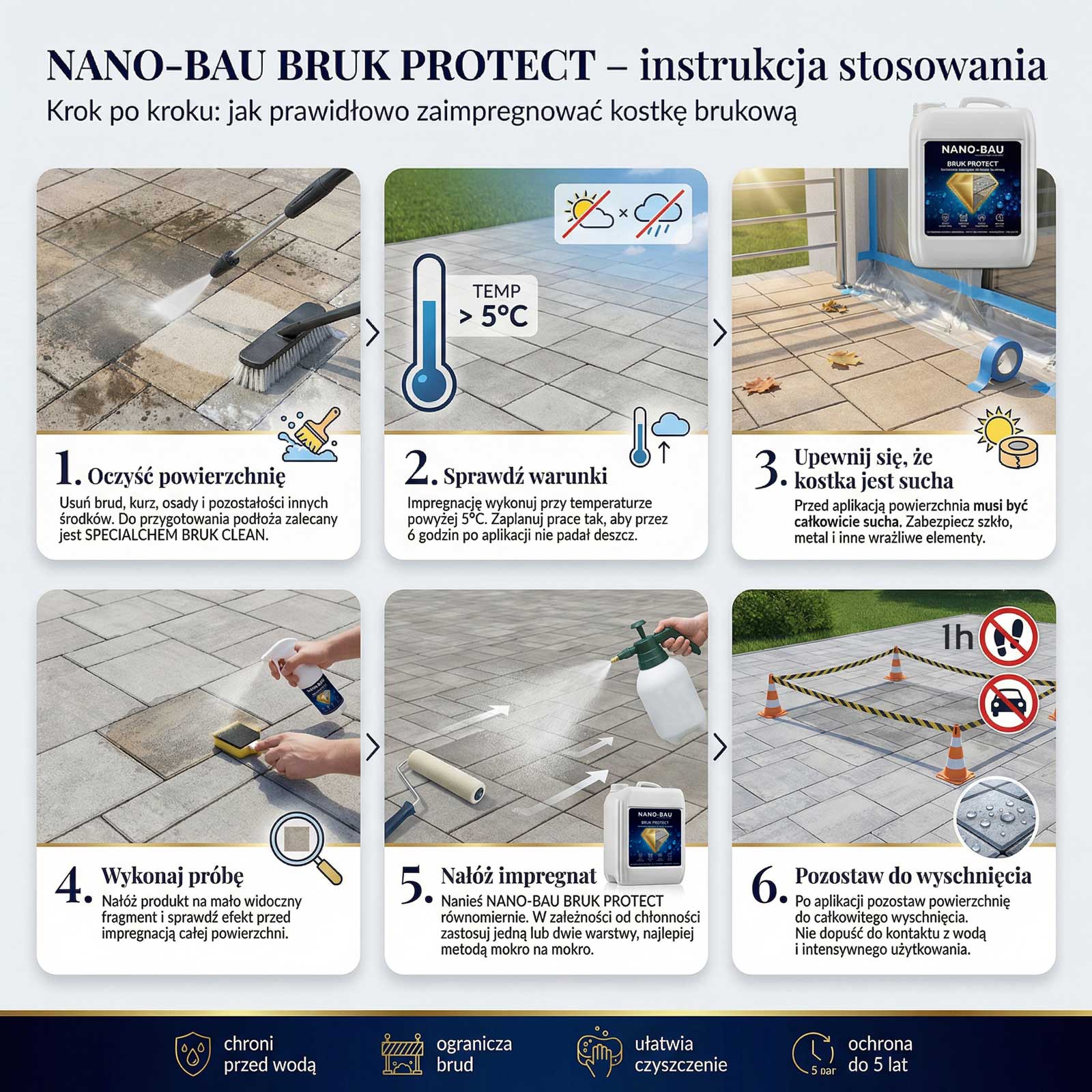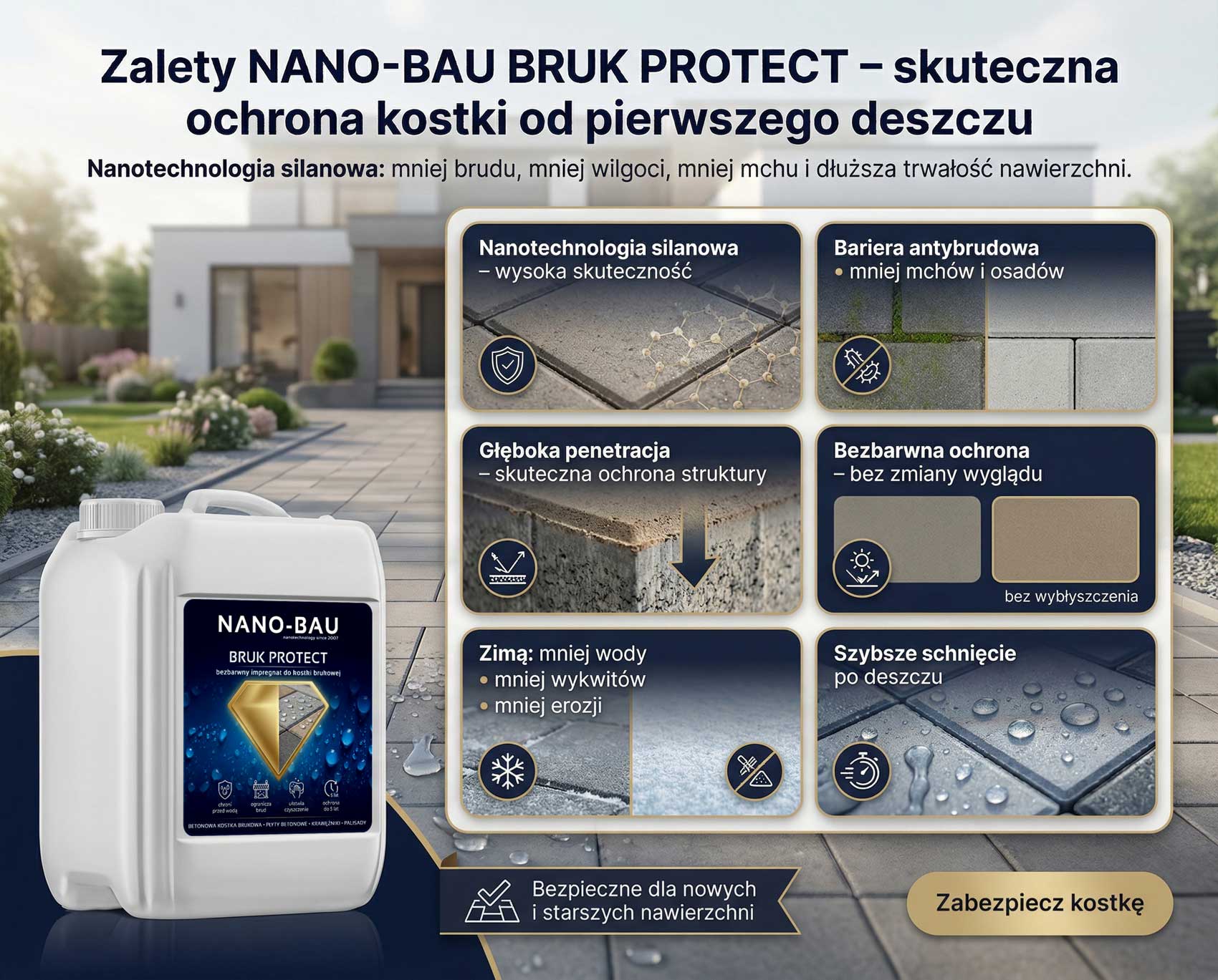 NANO-BAU BRUK PROTECT bezbarwny impregnat do kostki brukowej sprawdza się na podjazdach, ścieżkach, tarasach i innych powierzchniach wykonanych z kostki brukowej oraz elementów betonowych. Formuła hydrofobowa sprawia, że NANO-BAU BRUK PROTECT bezbarwny impregnat do kostki brukowej ogranicza chłonność podłoża i ułatwia późniejsze czyszczenie nawierzchni. To właśnie dlatego NANO-BAU BRUK PROTECT bezbarwny impregnat do kostki brukowej jest dobrym wyborem wszędzie tam, gdzie kostka narażona jest na deszcz, błoto, sól drogową i osady atmosferyczne. Bezbarwna ochrona pozwala zachować naturalny kolor kostki, a jednocześnie poprawia jej odporność na typowe zabrudzenia eksploatacyjne. NANO-BAU BRUK PROTECT bezbarwny impregnat do kostki brukowej może być stosowany zarówno przy nowych nawierzchniach, jak i przy kostce użytkowanej od lat po odpowiednim oczyszczeniu. Opisy produktów z tej linii wskazują na hydrofobowe działanie, ochronę powierzchni betonowych oraz łatwiejsze utrzymanie ich w czystości.