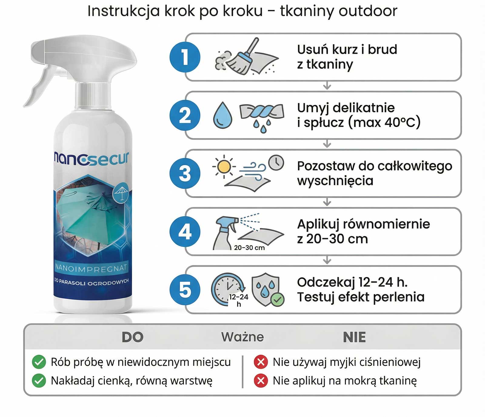 | Czy sama wodoodporność zapobiega glonom i mszystości? | Nie w 100% — cień i wilgoć nadal sprzyjają nalotom biologicznym. Impregnacja NANOSECUR impregnat do parasoli ogrodowych i markiz ogranicza wnikanie wody i ułatwia czyszczenie, co realnie zmniejsza ryzyko powrotu nalotów. |