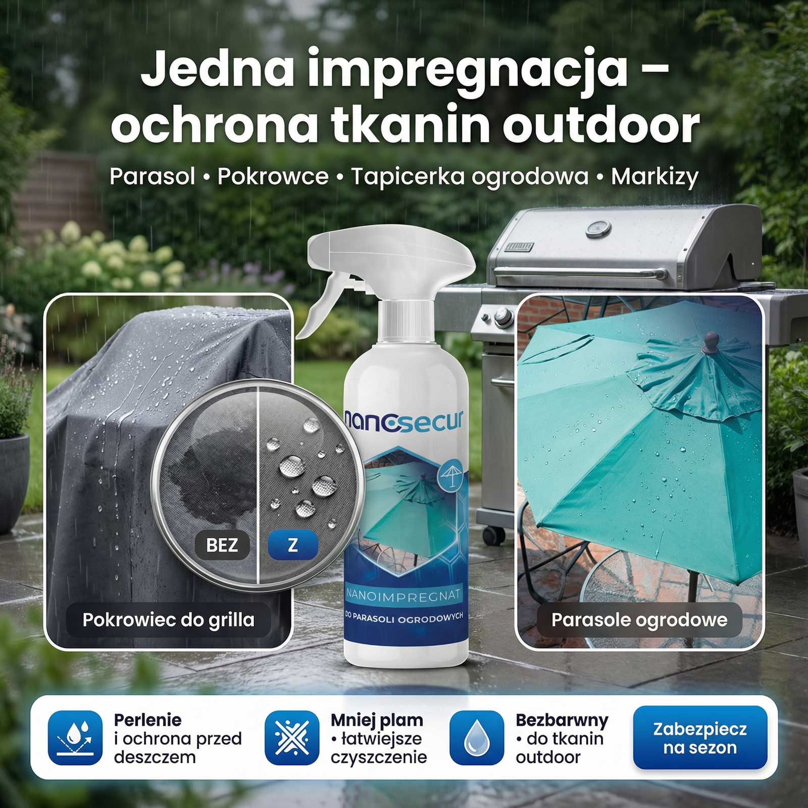 Masz wrażenie, że parasol ogrodowy albo markiza „pije” wodę, a po deszczu zostają zacieki, brud i trudne plamy? Jeśli szukasz rozwiązania na przeciekanie tkaniny, szybkie zabrudzenia i wilgoć w strukturze materiału, sięgnij po NANOSECUR impregnat do parasoli ogrodowych i markiz – preparat do impregnacji materiałów tekstylnych stosowanych m.in. w parasolach ogrodowych, zadaszeniach brezentowych i pokrowcach. Skuteczność opiera się na wnikaniu w strukturę włókien, co ogranicza wsiąkanie wody oraz powstawanie plam. Co istotne, NANOSECUR impregnat do parasoli ogrodowych i markiz nie „zatyka porów” oddychających tkanin, więc materiał zachowuje swoje właściwości użytkowe.