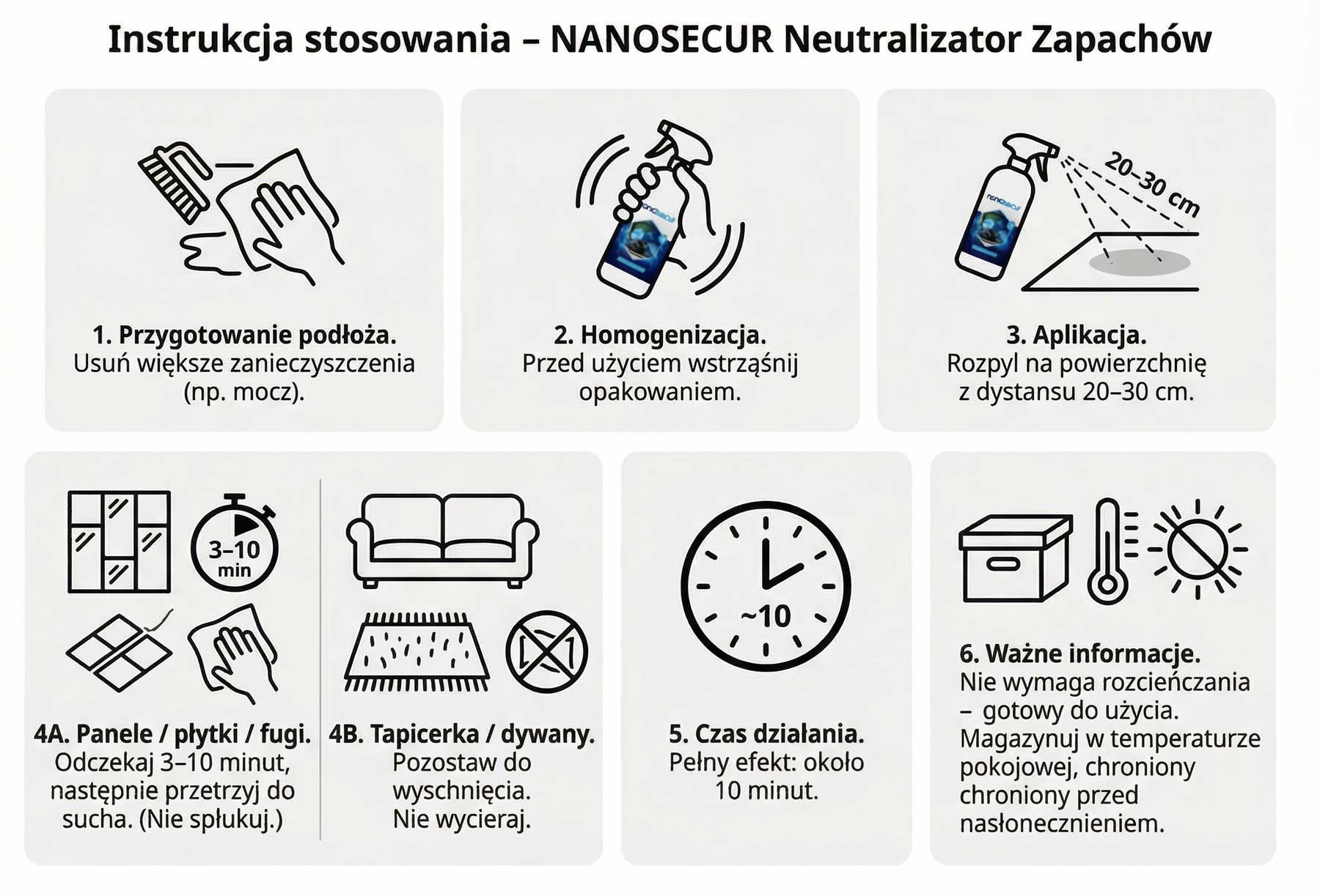 Tak, to naprawdę bardzo ważne! Przed aplikacją NANOSECUR należy dokładnie oczyścić powierzchnię ze wszystkich zabrudzeń i pozostałości organicznych. Jeśli nie usuniesz źródła zapachu (na przykład resztek wymiocin czy moczu), to preparat zadziała tylko na chwilę, zamiast go trwale usunąć. Najpierw umyj, potem zastosuj NANOSECUR.