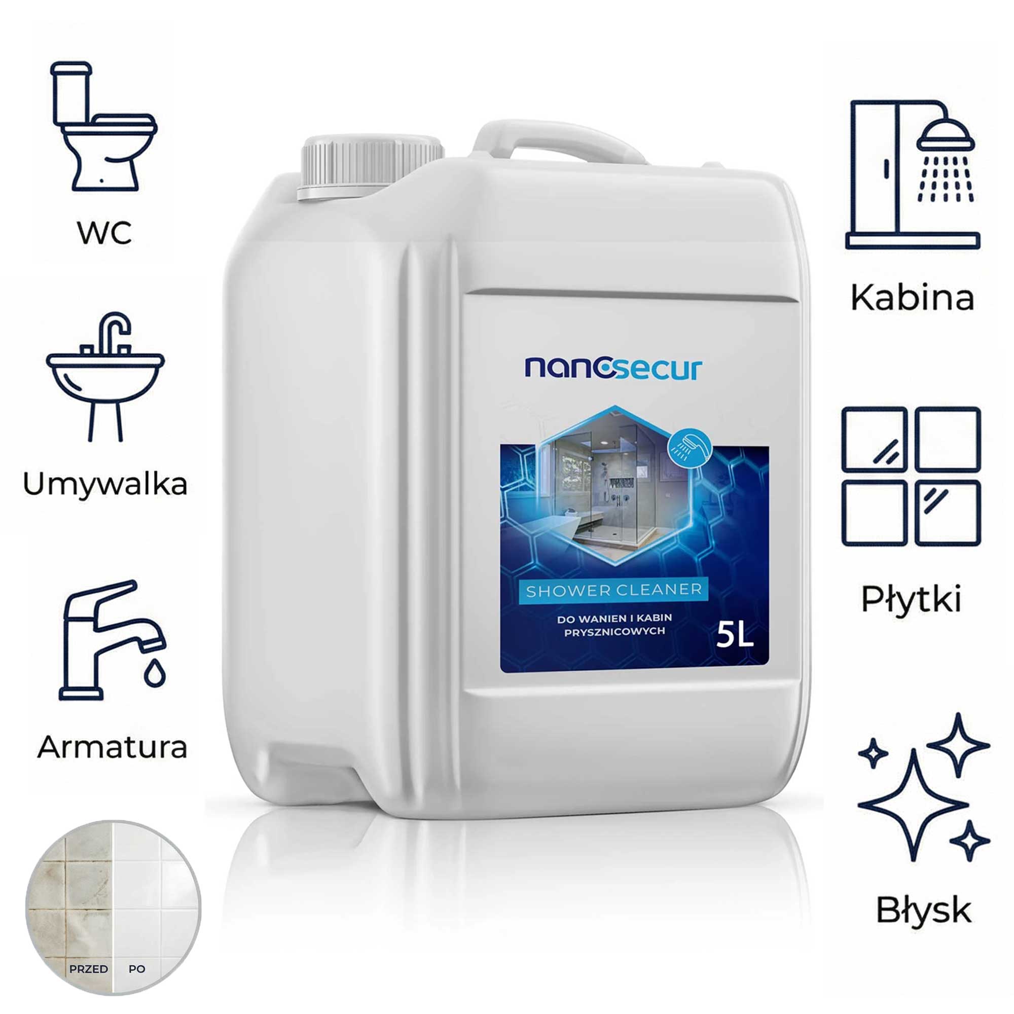 NANOSECURE SHOWER CLEANER Innowacyjna pianka do czyszczenia kabin prysznicowych, wanien, brodzików, sanitariatów i toalet zawierający cząstki srebra oraz powłokę utrudniającą ponowne zabrudzenie. Skutecznie usuwa kamień, rdzę, mydło, osady, tłuszcze, zażółcenia i inne zacieki. Dzięki zastosowaniu cząsteczek srebra, płyn pozostawia na oczyszczonej powierzchni aktywną powłokę, która ogranicza rozwój bakterii i grzybów. Nie pozostawia smug ani zacieków. Produkt zawiera związki czyszczące pochodzenia roślinnego oraz kwasek cytrynowy, dzięki czemu jest wyjątkowo neutralny dla zdrowia ludzi i zwierząt. Produkt ulega biodegradacji.