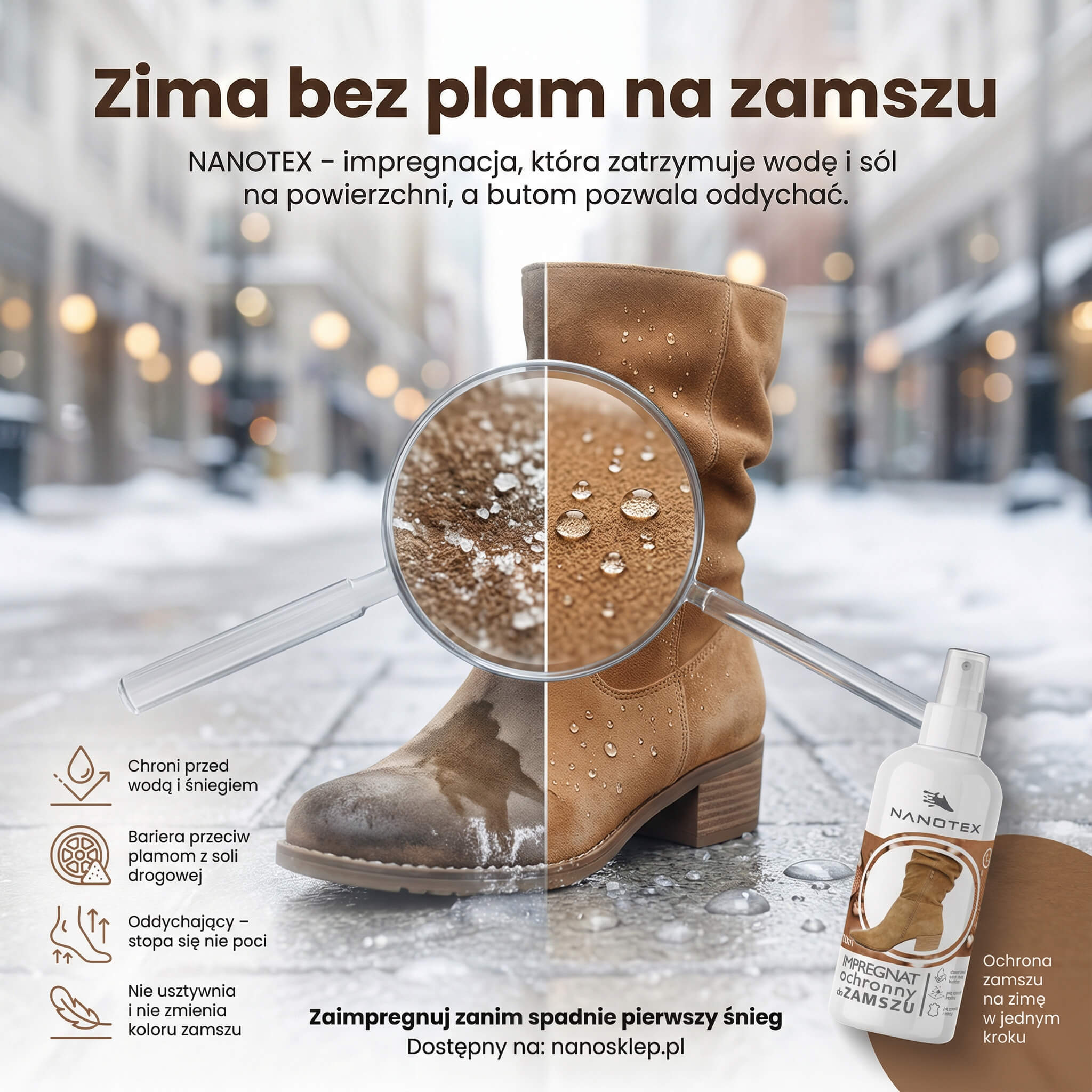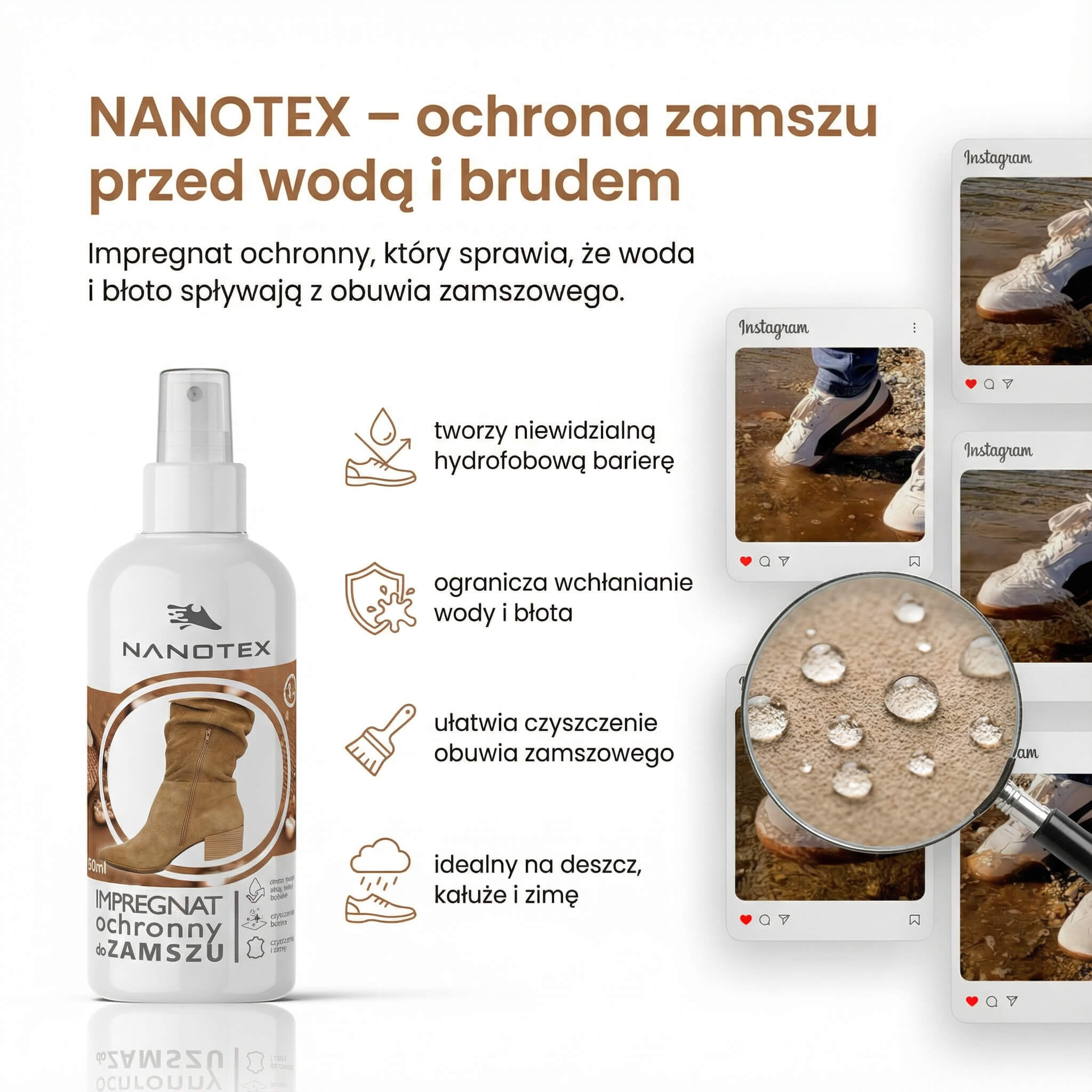 Innowacyjny impregnat ochronny do obuwia to specjalnie stworzony produkt do ochrony butów z zamszu, nubuku i skóry nie lakierowanej. Silnie hydrofobizuje zabezpieczone obuwie, dzięki czemu woda deszczowa ani błoto nie penetruje do ich wnętrza.