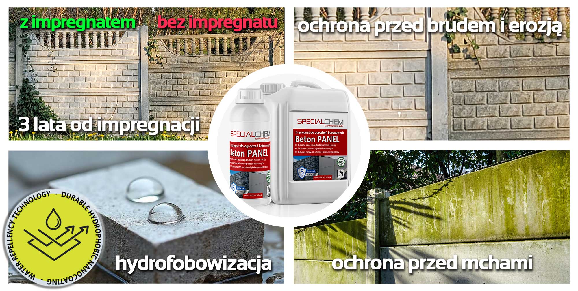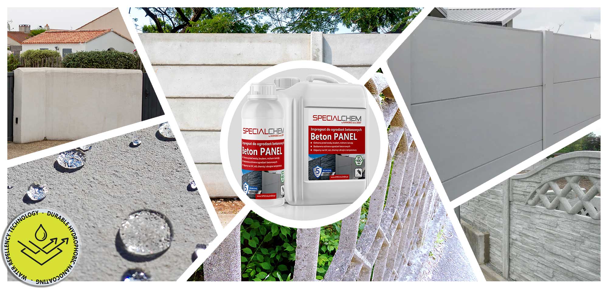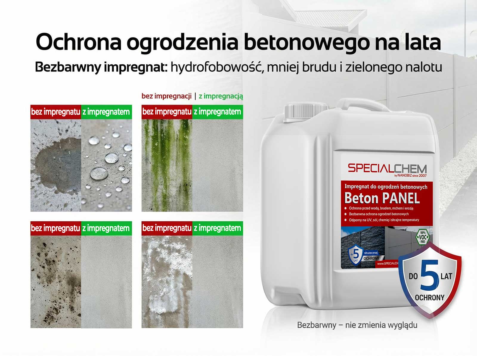 Specialchem BETON PANEL impregnat do płotów betonowych to impregnat do płotów betonowych, opracowany w technologii nanotechnologicznej, doskonały do bezbarwnej ochrony ogrodzeń panelowych, palisad oraz innych elementów betonowych. Preparat skutecznie impregnuje i hydrofobizuje powierzchnie, zapobiegając przenikaniu wody oraz zanieczyszczeń do wnętrza materiału.