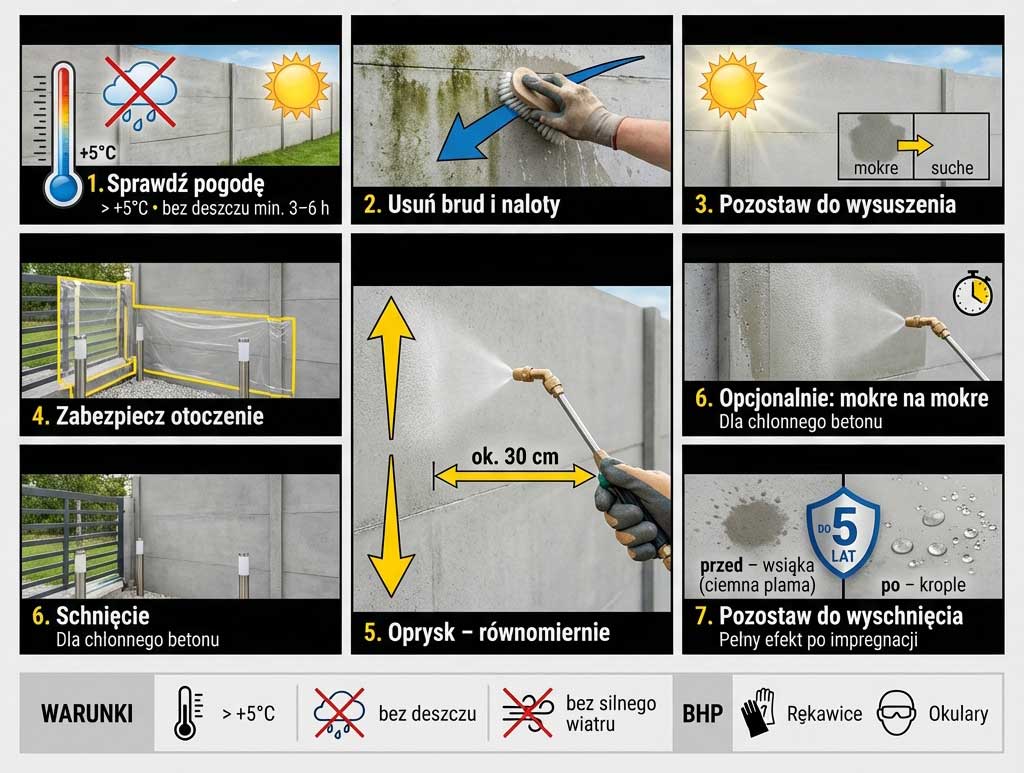| 8. W jakich warunkach można pracować? | Temperatura powietrza i betonu powinna wynosić ≥ +5 °C. Nie impregnuj w pełnym słońcu ani tuż przed deszczem; zaplanuj co najmniej 3 h bez opadów po zakończeniu pracy. |