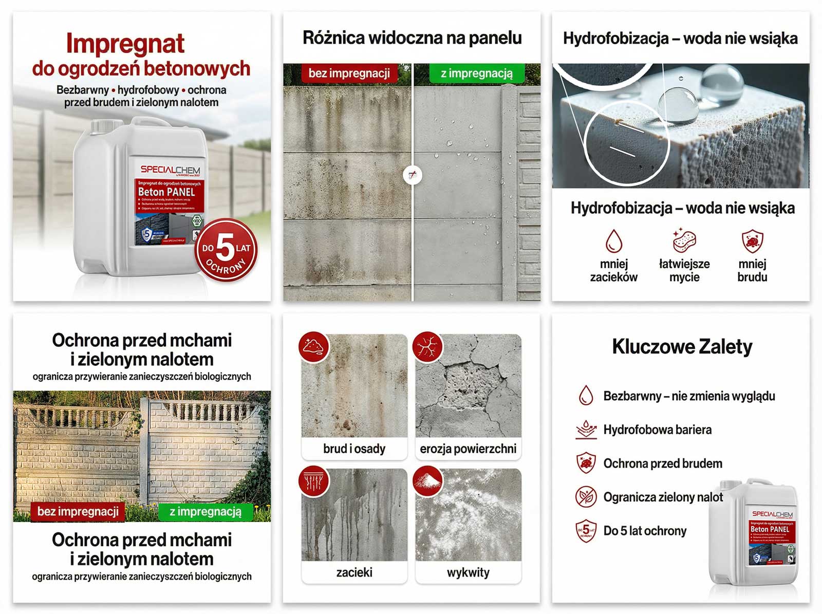 | 2. Jakie efekty daje impregnacja? | Impregnacja przy użyciu Specialchem BETON PANEL impregnat do płotów betonowych hydro- i oleofobizuje powierzchnię: woda, sól drogowa, kwaśne deszcze i brud nie wnikają w beton. Preparat zmniejsza ryzyko korozji zbrojenia, pękania, erozji oraz powstawania białych wykwitów, hamuje rozwój mchów i glonów, podnosi mrozoodporność i przedłuża estetykę ogrodzenia. |