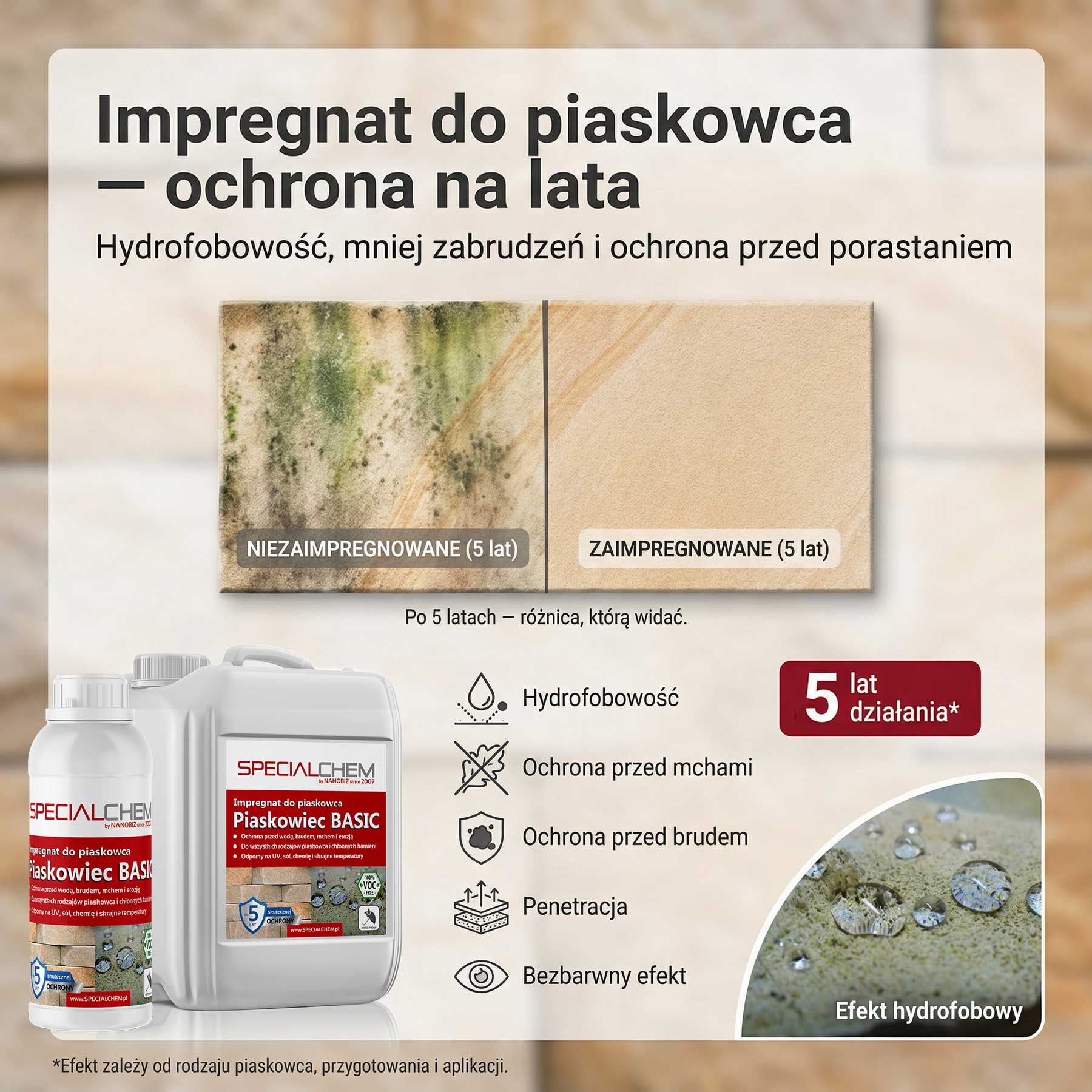 SPECIALCHEM PIASKOWIEC BASIC Impregnat hydrofobowy do piaskowców to profesjonalny preparat do zabezpieczania piaskowca oraz innych kamieni chłonnych na elewacjach, murach, ogrodzeniach i posadzkach. Impregnat tworzy hydrofobową barierę wewnątrz struktury kamienia, dzięki czemu redukuje chłonność, ogranicza wnikanie wody i zabrudzeń oraz poprawia odporność powierzchni na czynniki atmosferyczne. Zastosowana technologia pozwala zachować naturalną paroprzepuszczalność – kamień nadal „oddycha”, a jednocześnie jest skutecznie chroniony przed wilgocią, solami i przyspieszoną degradacją.