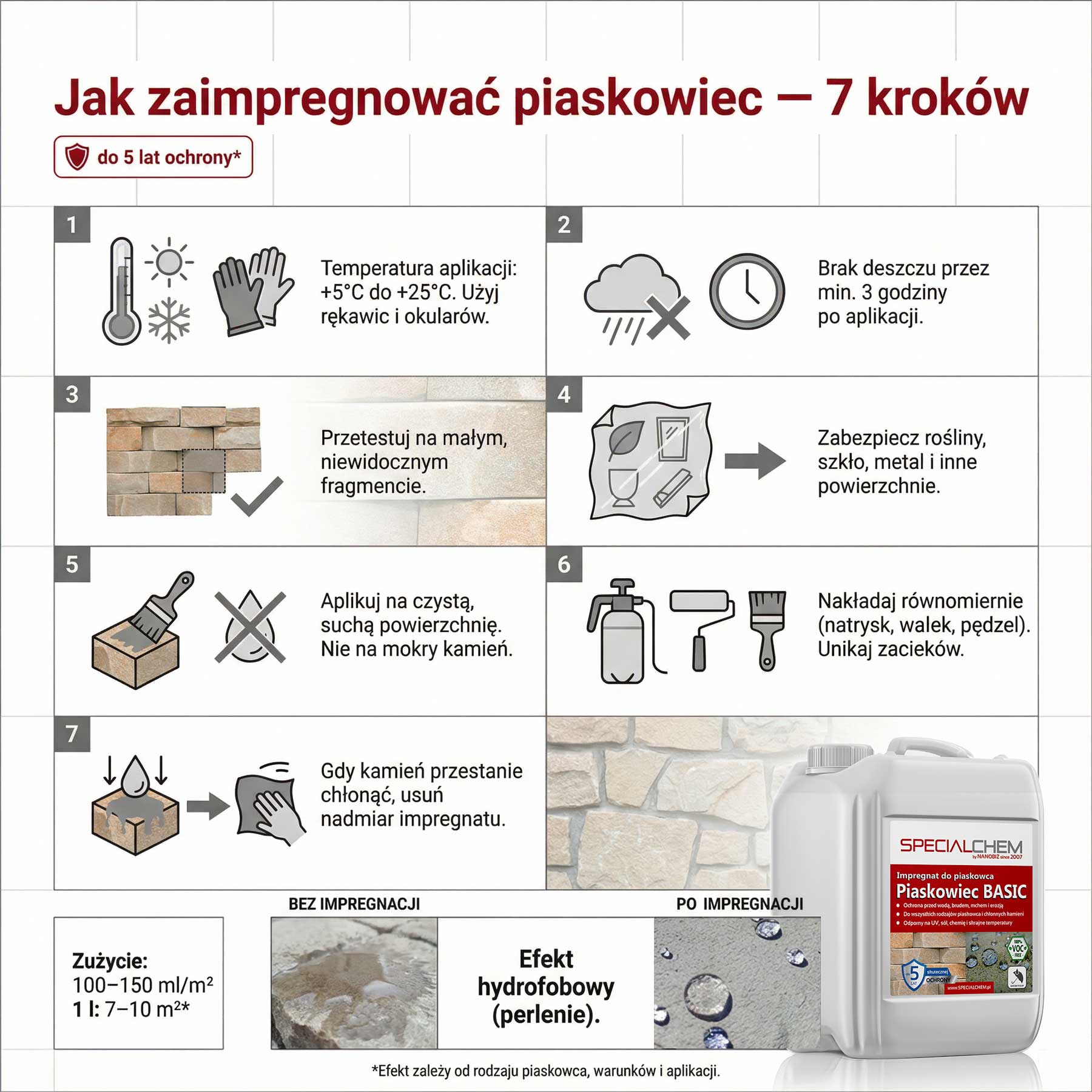 Orientacyjne zużycie: 100–150 ml/m² (w zależności od chłonności kamienia i sposobu aplikacji).