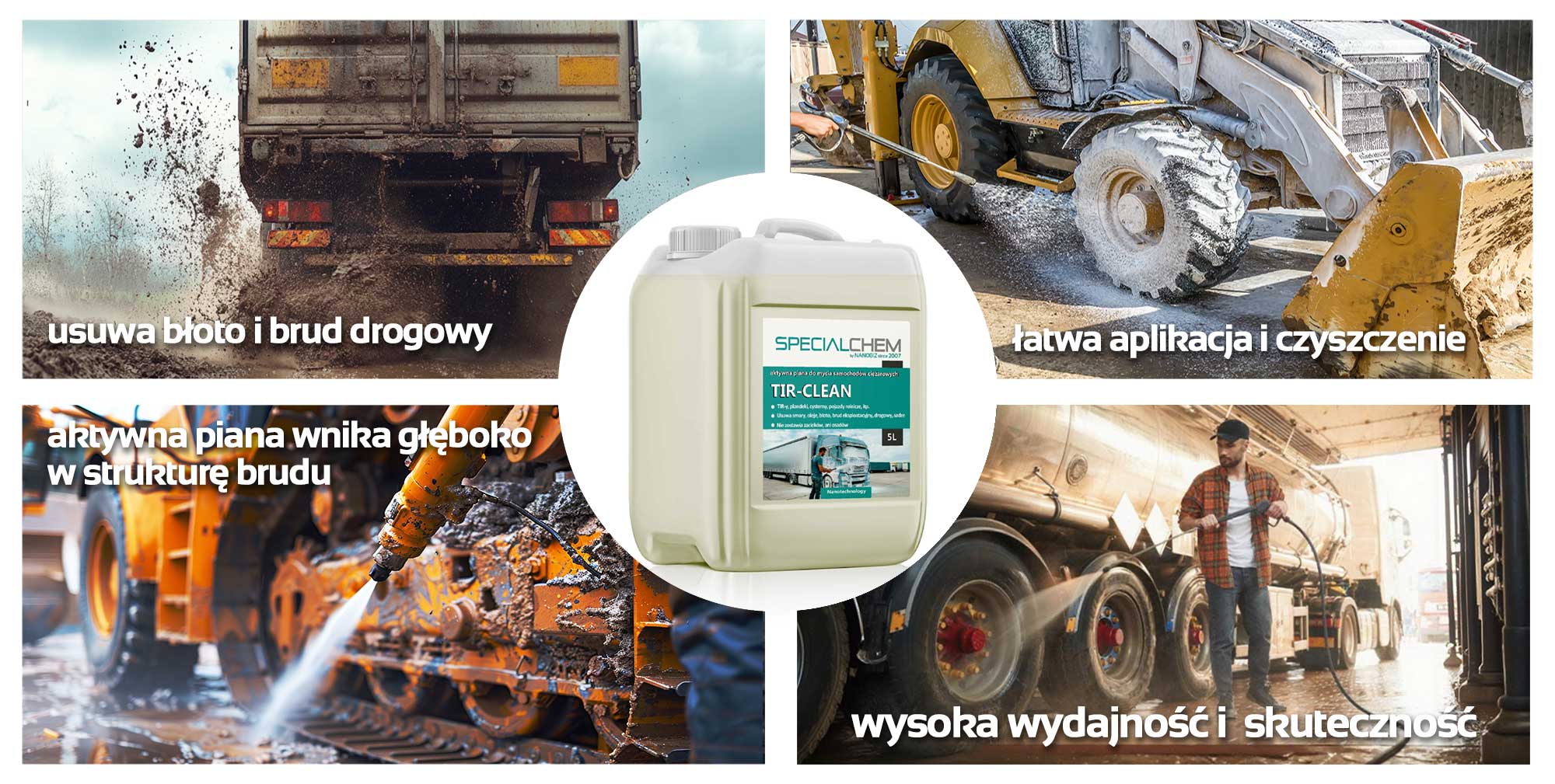 SPECIALCHEM TIR CLEAN to przełomowa aktywna piana do mycia ciężarówek, która redefiniuje standardy czystości w transporcie ciężkim. Ten silnie zasadowy koncentrat wykorzystuje zaawansowaną jednofazową formułę do skutecznego usuwania nawet najbardziej uporczywych zabrudzeń. Preparat został specjalnie opracowany dla skrajnie zabrudzonych powierzchni w pojazdach komercyjnych i przemysłowych.